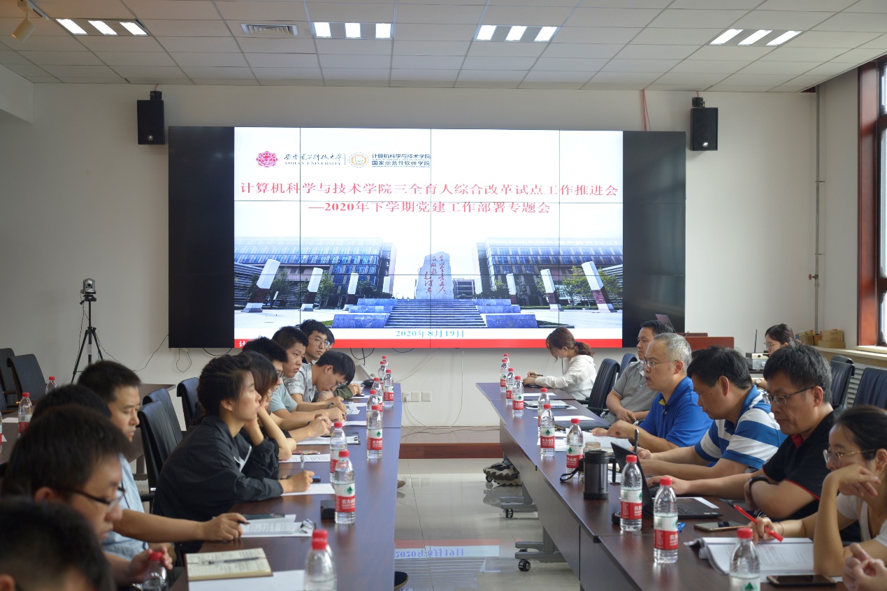(通讯员 同榛)为进一步拓展基层党建和思想政治工作思路,推动学院“三全育人”综合改革试点工作,8月19日下午,计算机科学与技术学院在北校区主楼二区319会议室召开“三全育人”综合改革试点工作推进会,部署新学期学院基层党建工作。学院党委副书记张莹莹、组织员张卫东、教职工党支部书记、本硕博师联合党支部书记、团委书记等共25人参会,会议由学院党委书记李青山主持。