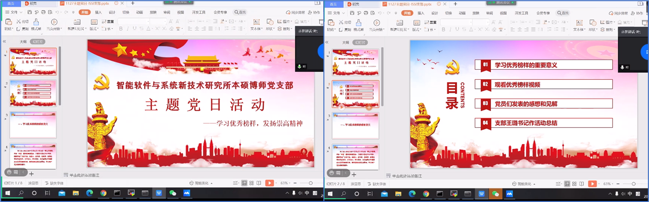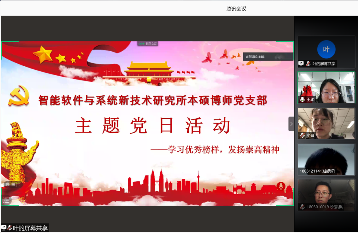 (通讯员 张凯琪)为了深入贯彻习近平总书记关于学习老一辈工作楷模、传承“五老”精神的重要指示,学习和发扬老一辈优秀榜样的崇高精神,计算机科学与技术学院智能软件与系统新技术研究所本硕博师联合党支部于2020年11月27日下午开展了“学习优秀榜样,发扬崇高精神”主题党日活动。活动由支部青年委员叶国强同志主持,共计47人参加,采用腾讯会议线上召开的方式进行。