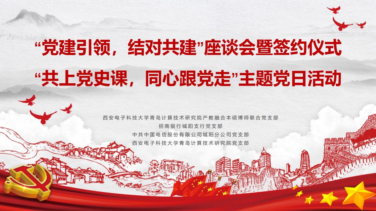 4月23日下午,党支部共建各方代表齐聚西电青岛研究院,共同举办合作共建签约仪式暨“共上党史课,同心跟党走”主题党日活动。西电计算机科学与技术学院党委副书记、党委委员、纪委书记张莹莹,西电青岛计算技术研究院产教融合本硕博师联合党支部书记、计科院党委委员向麟海,西电计科院团委书记李栋,辅导员党支部书记梁双杰,党建与学生工作办公室主任同榛,中共中国电信股份有限公司城阳分公司党支部书记、总经理刘祖洺,党支部纪委委员、副总经理赵腾,招商银行城阳支行副行长、工会主席、支部委员会纪检委员李苹苹,西电青岛计算技术研究院党支部书记王建东参加了座谈会。会上,各党支部代表分别介绍了党支部的基本情况,同时以“党建引领,结对共建”为主题展开深入交流,并就工作目标达成一致意见:今后各方要共筑组织基础、共促队伍建设、共办实事好事,通过搭建党建学习活动平台、分享工作资源、交流工作经验、解决实际问题等途径,实现党的建设与学院、企业发展良性互动。
