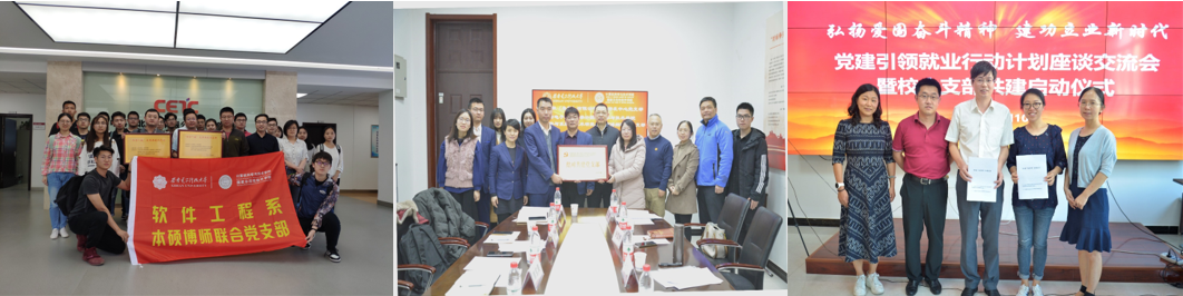 坚持问题导向,创新学生支部设置。学院党委聚焦基层大学生党建工作中的“痛点”,针对学院学生党支部均依托年级、班级设置,存在着“普遍基础弱、建设周期短、党支部工作覆盖面不足,无法形成有传承的支部文化,支部党建与育人工作融合不够”等问题,依托学院8个研究所、国家示范性软件学院特殊办学机制和青岛计算技术研究院的产教协同基地成立17个本硕博师联合党支部。积极构建并完善“本硕博师”联合党支部组织建设模式,党员构成包括博硕士党员+本科生党员,并选拔一名优秀青年教师党员任党支部书记。针对联合支部建设模式,加强支部工作、规范党员发展、党建引领团学、支部协同育人等方面工作机制建设。建立健全联合支部制度体系,出台《计算机科学与技术学院关于加强本硕博师联合党支部建设的工作方案(试行)》、《计算机科学与技术学院本硕博师联合党支部党员发展工作管理办法》、《计算机科学与技术学院本硕博师联合党支部党建引领团学建设实施办法》和《计算机科学与技术学院本硕博师联合党支部协同育人实施办法》等制度。构建多方参与的联合支部协同育人机制,在纵向维度上发挥联合支部“本硕博师”组织力,在横向维度上发挥学工队伍管理服务和组织引领、教学队伍支部共建和教学相长、科研团队科研育人和专业传授、团学班组指导协同和学业帮扶、行政管理沟通协调和解决问题的作用。《本硕博师联合党支部的党建育人模式》获评2019年学校十大基层党建特色案例。