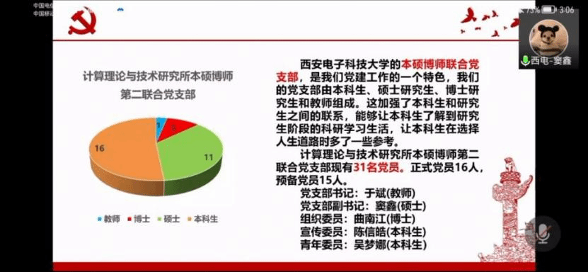 (通讯员 赵佳惠)1月9日下午,西安电子科技大学计算机科学与技术学院计算理论与技术研究所本硕博师第二联合党支部携手西安交通大学电气学院南洋书院师生联合第三党支部,通过腾讯会议线上召开了以“众志成城抗疫情,凝心聚力克时艰”为主题的党建共建活动,在交流互鉴中为两支部成员带来了精神的鼓舞!活动由西电计科院计算理论与技术研究所本硕博师第二联合党支部书记于斌同志主持。
