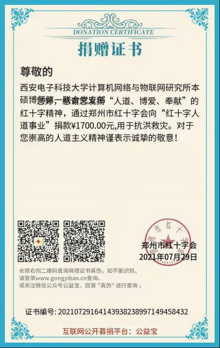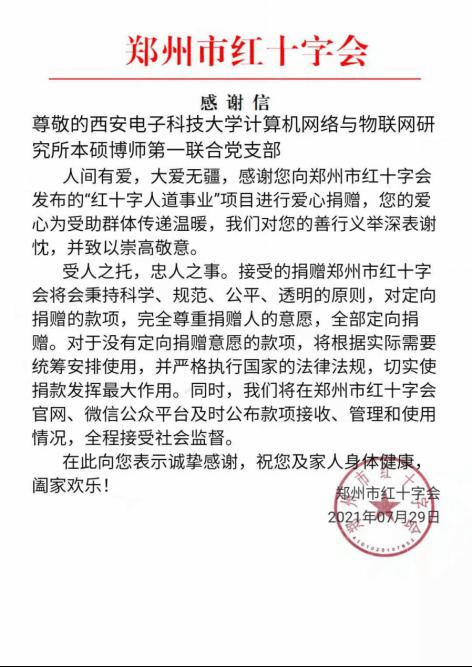 灾情深深牵动着每一个中国人的心,7月24日,西安电子科技大学计算机网络与物联网研究所本硕博师第一联合党支部发起“防汛抗洪驰援河南”募捐倡议,倡导大家尽自己所能献出一份爱心,以实际行动支持河南防汛救灾。该倡议得到支部党员们的积极响应,截至日前,计算机网络与物联网研究所本硕博师第一联合党支部共筹集到了1700元善款。该善款已汇至河南省郑州红十字会账户,用于抗洪救灾工作。