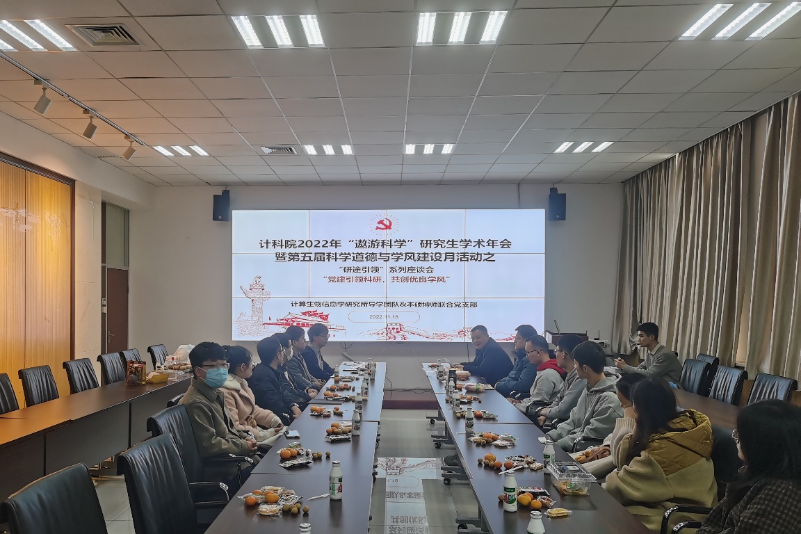 (通讯员 张明婕)11月18日下午,计科院计算生物信息学研究所本硕博师联合党支部在主楼Ⅱ区319会议室,举办了计科院2022年“遨游科学”研究生学术年会暨第五届“科学道德与学风建设月”活动之“研途引领”座谈会,座谈会以“党建引领科研,共创优良学风”为主题,旨在通过开展科研经验、学术成长等方面的交流分享,促进师生传帮带,共谈学术规范,树立科研风范,弘扬优良学风。