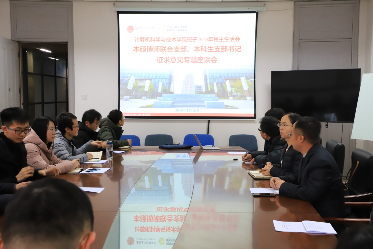 (通讯员 同榛)1月16日下午,计算机科学与技术学院班子2018年民主生活会本硕博师联合支部、本科生支部书记征求意见座谈会在南校区G楼514会议室召开。本硕博师联合支部、本科生支部书记、大三大四年级辅导员参加了会议,会议由学院党委书记李青山同志主持。学院党委副书记张莹莹同志参加了座谈。