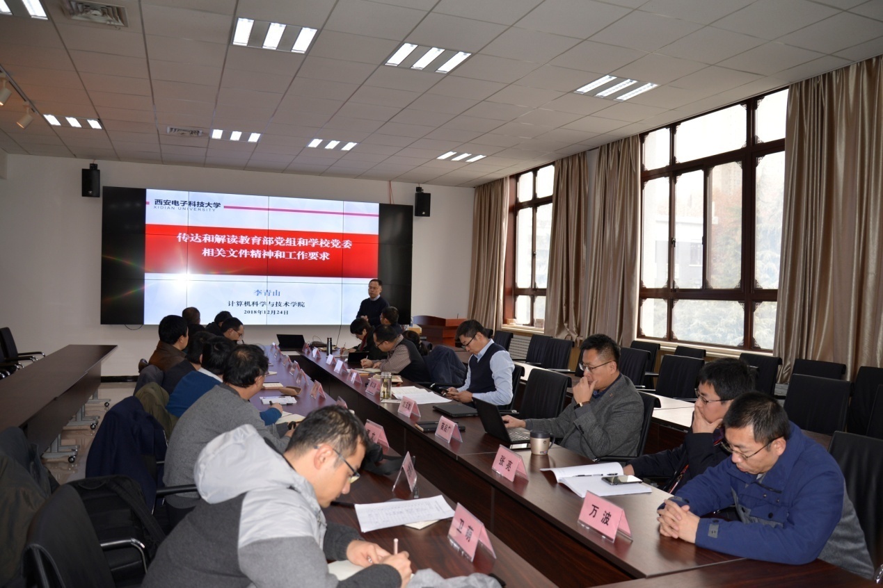 学院副院长田聪就教育部学位管理与研究生教育司关于研究生教育相关精神和要求进行了传达,重点解读了深化研究生教育系统改革的8个重点方向。副院长苗启广就本科教育工作会议精神有关精神进行了传达,特别是从课程改革角度对“什么是金课、建设五大金课”等进行了解读,结合学院本科课程实际设置情况提出“加强重视、提前部署、挖掘特色”等工作思路。副院长赵韩强就《计算机科学与技术学院2018-2020年岗位聘任工作实施细则》向与会成员做全面传达和解读,明晰了“师德为先、业绩为重”的岗位聘任工作理念,更加明确了岗位聘任工作的重点。副院长沈玉龙传达了《关于开展“四唯”专项清理行动的通知》精神,重点解读了“四唯”现象的清理方向,明确了行动重点。