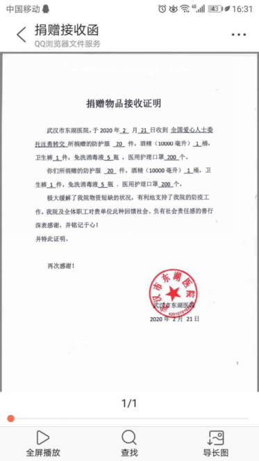 武汉东湖医院捐赠物品接收证明
