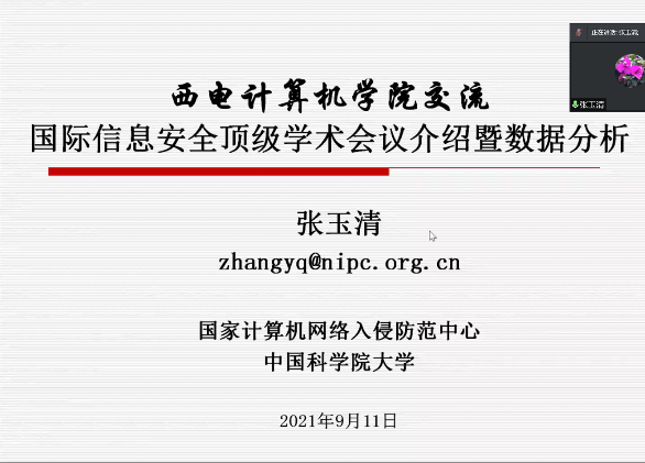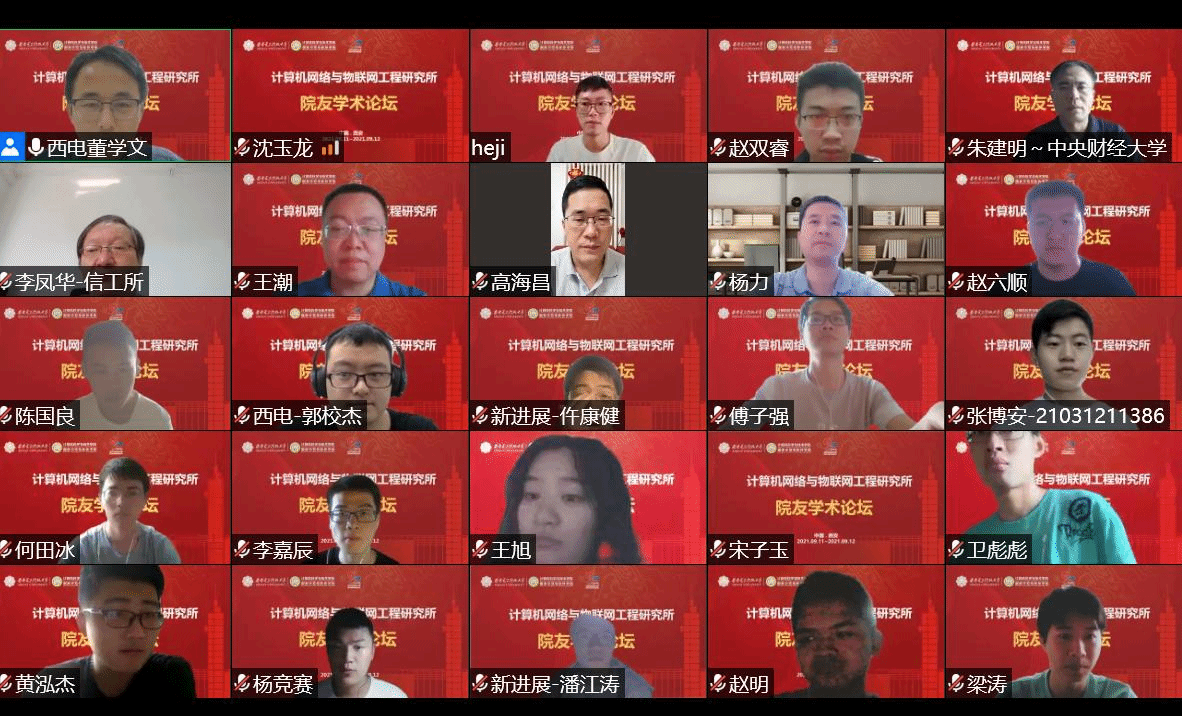 (通讯员 董学文)为迎接我校九十周年华诞,进一步增加院友与学院的联系,促进学术交流与合作,拓宽师生学术视野,扩大学院学术影响力,2021年9月11日至9月12日,我院举办了西安电子科技大学计算机网络与物联网工程研究所院友学术论坛。本次论坛由陕西省网络与系统安全重点实验室主办,计算机网络与物联网工程研究所承办,以线上线下结合的形式开展。论坛围绕计算机网络安全领域的最新学术进展,邀请了中国科学院大学、西安交通大学、中央财经大学、上海大学、兰州理工大学、河南工业大学等国内计算机学科优势高校的网络与安全领域青年教师进行学术交流,并通过主题报告、交流沙龙的形式分享了智能计算机网络和安全领域的理论和技术新进展,加强了实验室学术前沿交流,扩大了我校计算机学科的知名度与影响力。论坛吸引了国内外计算机网络和安全领域相关师生和从业人员的广泛参加,论坛参与人次超500。