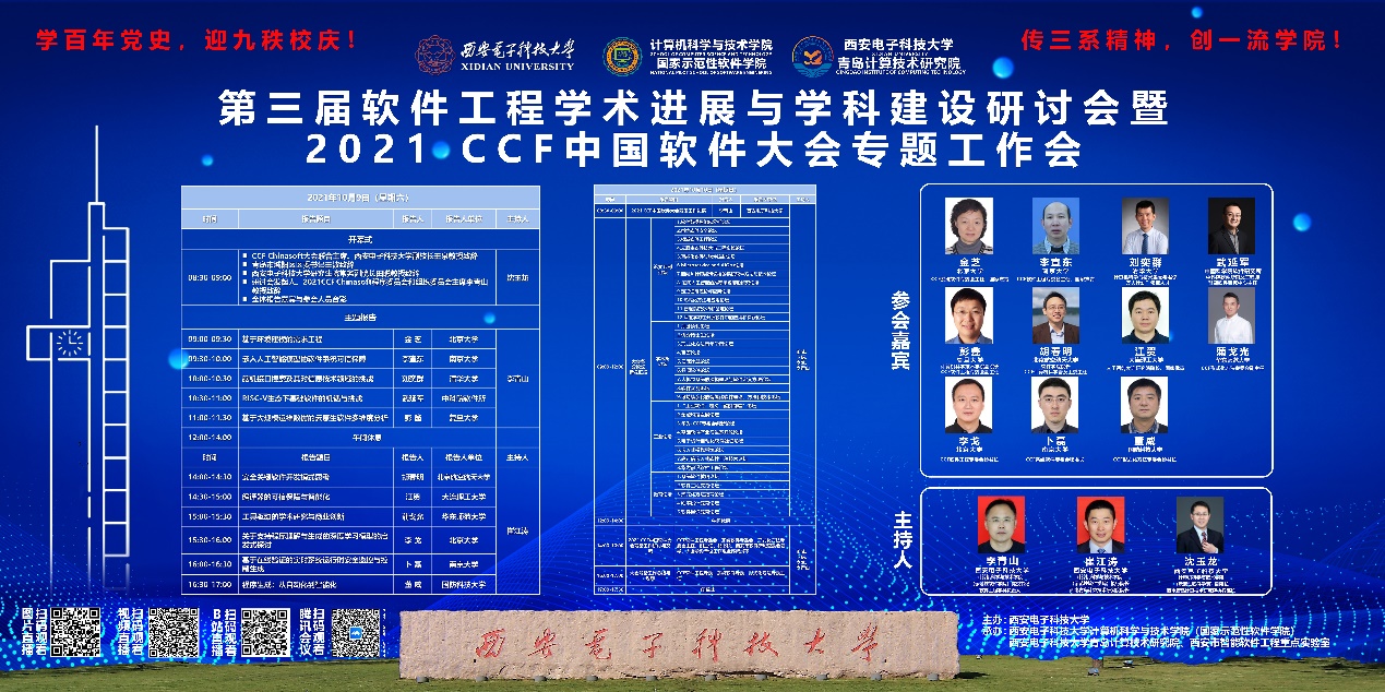 (通讯员 徐悦甡)2021年10月9日至10日,第三届软件工程学术进展与学科建设研讨会暨2021 CCF中国软件大会专题工作会在西安电子科技大学青岛计算技术研究院成功举办。会议由西安电子科技大学软件工程学科主办,计算机科学与技术学院(国家示范性软件学院)、西安电子科技大学青岛计算技术研究院与西安市智能软件工程重点实验室承办。会议通过线上线下结合的方式进行,线下举办地为西电青岛产教融合研究生联合培养基地。