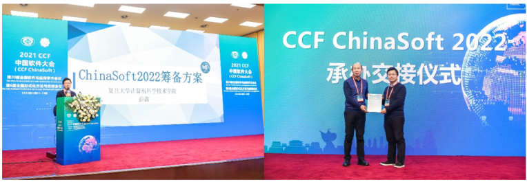 下一届CCF中国软件大会承办方代表,复旦大学计算机科学技术学院副院长彭鑫教授代表承办方进行承办方案宣讲,并与本届大会承办方西安电子科技大学举行了承办交接仪式。