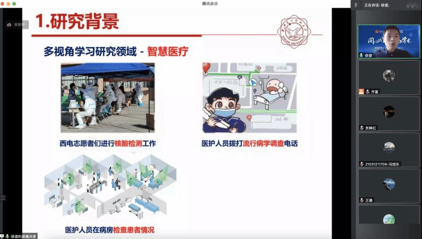 接着,智能媒体与数据工程研究所青年教师徐偲作题为“多视角深度表达学习及其应用研究”的报告。他针对社会各领域涌现的海量的多视角数据带来的极大挑战,分享了团队在深度多视角概念学习、不完整多视角数据聚类、基于用户多视角偏好的个性化推荐以及基于社会多视角数据的图像检索等研究方面取得的最新进展。同时,介绍了团队未来将在可信多视角决策融合、可解释的多视角表达学习等领域开展研究,并欢迎感兴趣的教师和研究生一起探索交流。最后,他鼓励研究生能够在疫情期间制定目标,做好规划,把握时间,共同进步。
