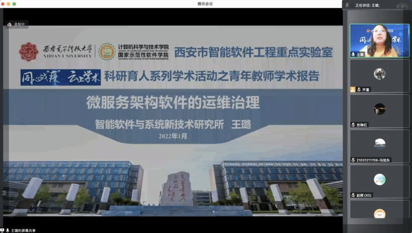 智能软件与系统新技术研究所王璐副教授就“微服务架构软件的运维治理”进行了详细的报告,她简要介绍了微服务软件的概念与特点,总结微服务架构运维管理的研究挑战,包括负载均衡,故障检测和弹性伸缩,重点对微服务架构软件运维治理相关的研究现状进行综述最后对团队目前开展的研究工作,包括微服务多维故障诊断方法、内外调用独立的负载预测技术、响应式扩展/预测式伸缩相结合的弹性伸缩策略以及容器镜像标签提取技术研究。最后,她建议研究生在论文选题时要全面考虑相应研究方向,对研究现状要进行全面分析,然后提炼出更好的新观点,同时,在试验阶段也要注重和产业界实际情况相结合,避免闭门造车。