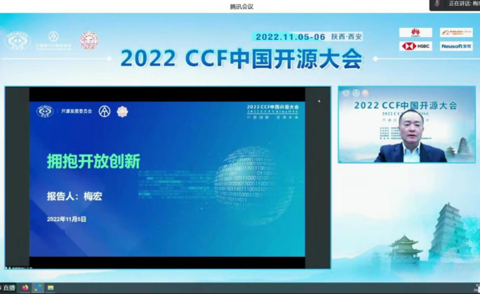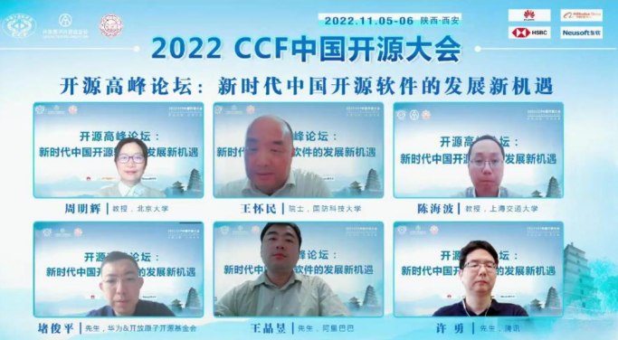 (通讯员 徐悦甡 崔笛)2022年11月5日上午9时,以“开源创新,引领未来”为主题的首届CCF中国开源大会(CCF ChinaOSC)通过线上方式开幕。CCF理事长、中国科学院院士梅宏教授,CCF开源发展委员会主任、中国科学院院士王怀民教授,西安电子科技大学校长张新亮教授,工信部信息技术发展司领导,大会共同主席、西安电子科技大学副校长王泉教授,大会共同主席、开放原子开源基金会理事长孙文龙研究员等专家,以及承办单位的领导出席了大会开幕式,并与所有参会代表共同参加了大会特邀报告和开源高峰论坛等活动。