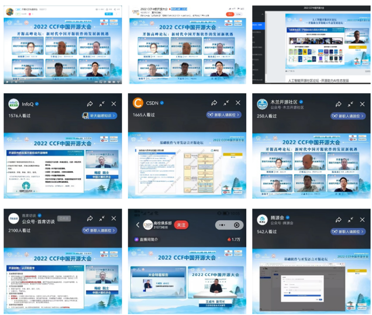 本届大会由中国计算机学会(CCF)与开放原子开源基金会联合主办,CCF开源发展委员会、西安电子科技大学承办,西安电子科技大学计算机科学与技术学院(国家示范性软件学院)、西电软件工程学科、西安市智能软件工程重点实验室具体实施。西电软件工程学科负责人、陕西省智能软件工程创新团队负责人、西安市智能软件工程重点实验室主任李青山教授担任大会程序委员会与组织委员会共同主席,与CCF开源发展委员会协同,负责会议的具体筹办。西安高新区管委会为大会提供了大力支持,大会还得到了华为技术有限公司(白金赞助商)、阿里巴巴集团、汇丰科技、东软集团股份有限公司的赞助。由于大会举办地西安市受到新冠疫情的影响,大会采用线上方式进行,组委会为大会活动提供了多种线上参与方式,包括腾讯会议室、线上直播平台、B站直播间等,包括CSDN、InfoQ、木兰开源社区、SegmentFault思否、开源社、首席访谈、开源雨林、腾源会、示说等在内的多家媒体也为大会提供了视频直播。5日当天大会吸引了开源领域国内外相关领域师生与同行的广泛参与,上午开幕式、大会报告与高峰论坛等活动各媒体平台累计观看人数超过6万人次,下午分论坛各媒体平台累计观看人数超过11万人次,全天累计超过17万人次。