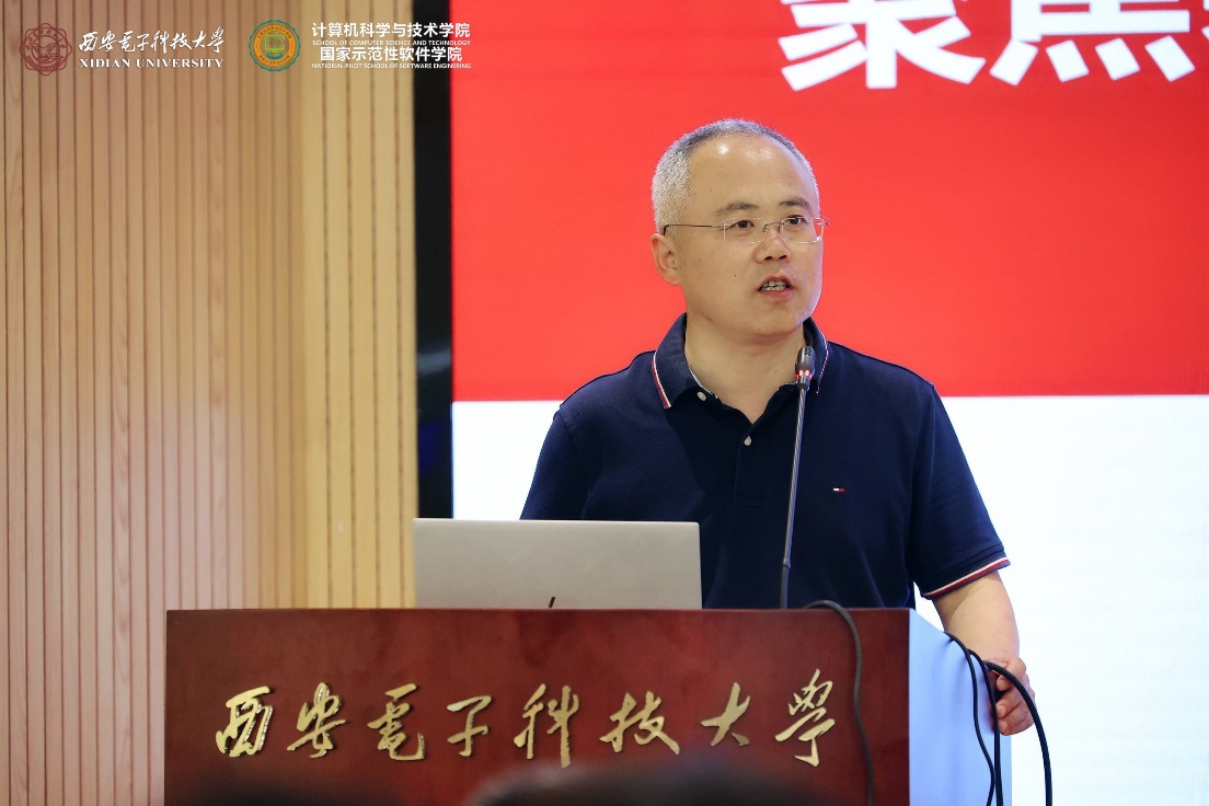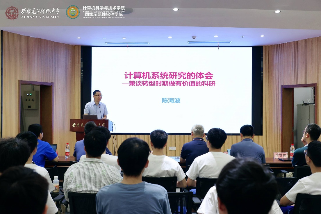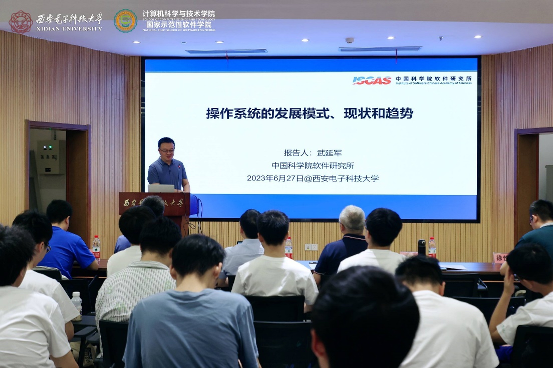 随后,在西安电子科技大学南校区会议中心101会议室成功举行了“聚焦基础软件 拥抱开源生态”的学术报告,李青山教授主持学术报告会并致欢迎词,热烈欢迎陈海波教授、武延军研究员的到访,并表示陈海波教授、武延军研究员是国产开源基础软件领域的知名学者,做出了一系列创新的学术成果,也领导着有影响力的科研团队,学院的各位青年教师和同学要珍惜这次交流的机会,虚心向陈海波教授、武延军研究员学习。