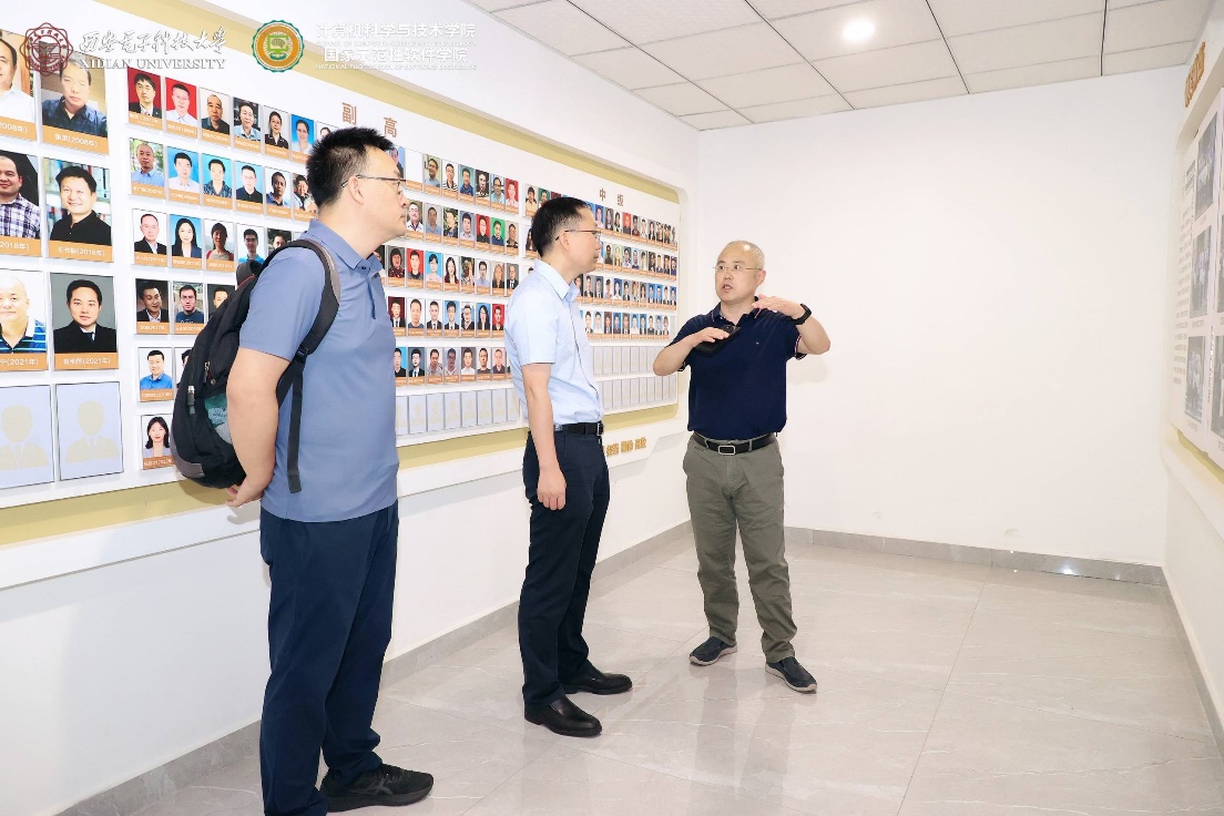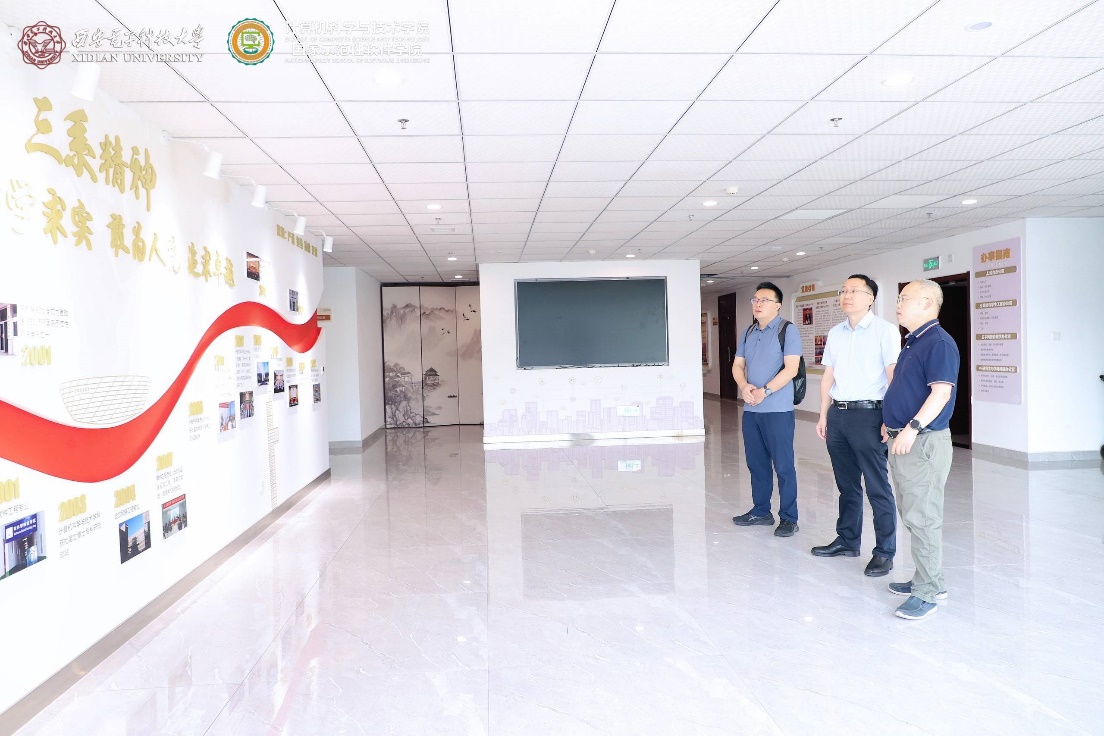 首先,陈海波教授、武延军研究员在李青山教授陪同下,参观了计算机科学与技术学院在新启用的网络安全创新研究大楼中的文化墙建设。李青山教授讲解了学院的发展历程,介绍了学院在专业建设、学科建设、科学研究、党建创新、人才培养等方面取得的成果。