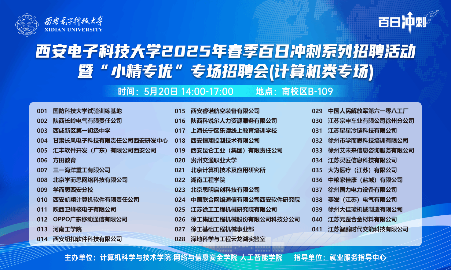(通讯员 奚晶瑾)为落实教育部春季促就业攻坚行动,促进计算机大类毕业生高质量充分就业,5月20日下午,西安电子科技大学2025年春季百日冲刺系列招聘活动暨“小精专优”专场招聘会(计算机类专场)在南校区B教学楼109教室举办。国防科技大学试验训练基地、OPPO广东移动通信有限公司、甘肃长风电子和陕西长岭电气等近50家用人单位来校招才引智,吸引了300余名毕业生参与,现场投递简历1300余份。本次双选会在就业指导服务中心指导下,由计算机科学与技术学院、网络与信息安全学院、人工智能学院联合主办。
